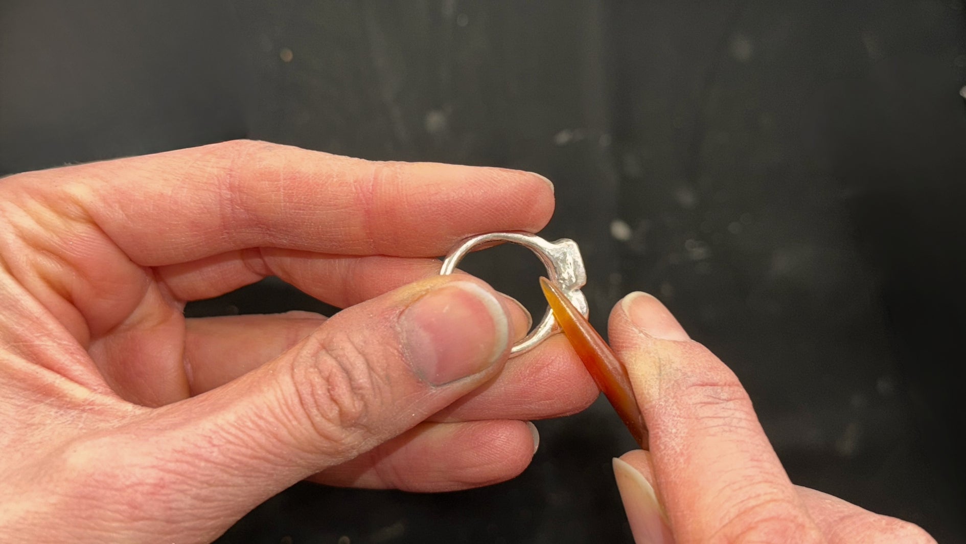 Tot slot wordt het zilver met een glad stuk Agaat glansverdicht, waardoor het oppervlak harder, gladder en dieper van glans wordt.