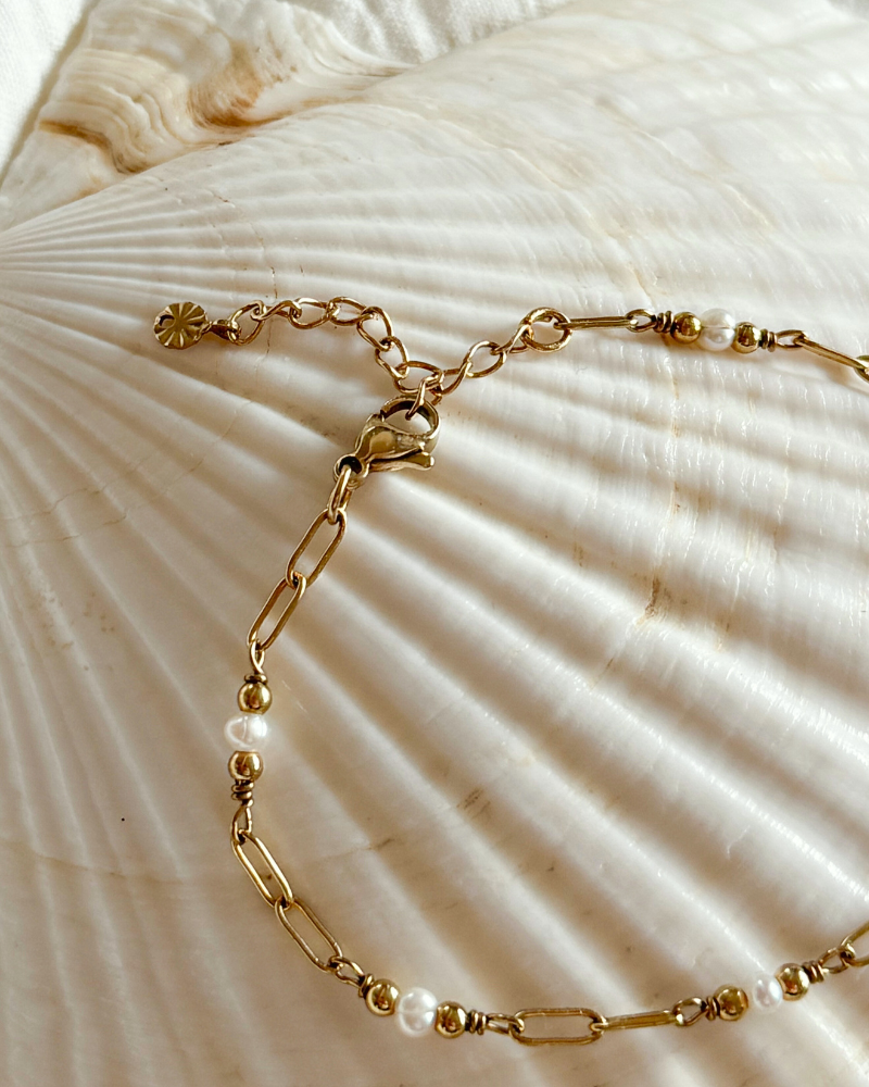 De Kaia armbandje met pareltjes is een subtiel, elegant sieraad van goud stainless steel en echte zoetwaterparels.