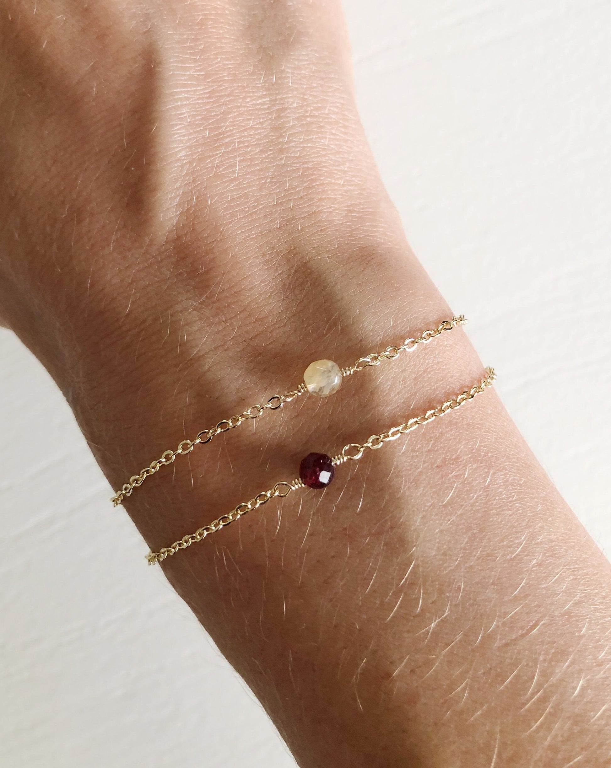 14k gold plated geboortesteen armband. Met de dunne, gouden chain en enkele edelsteen is deze armband heel subtiel. Makkelijk om te combineren en ook perfect om cadeau te doen. Net zoals alle sieraden uit mijn shop, worden ook deze minimalistische birthstone armbanden inclusief cadeauverpakking geleverd.