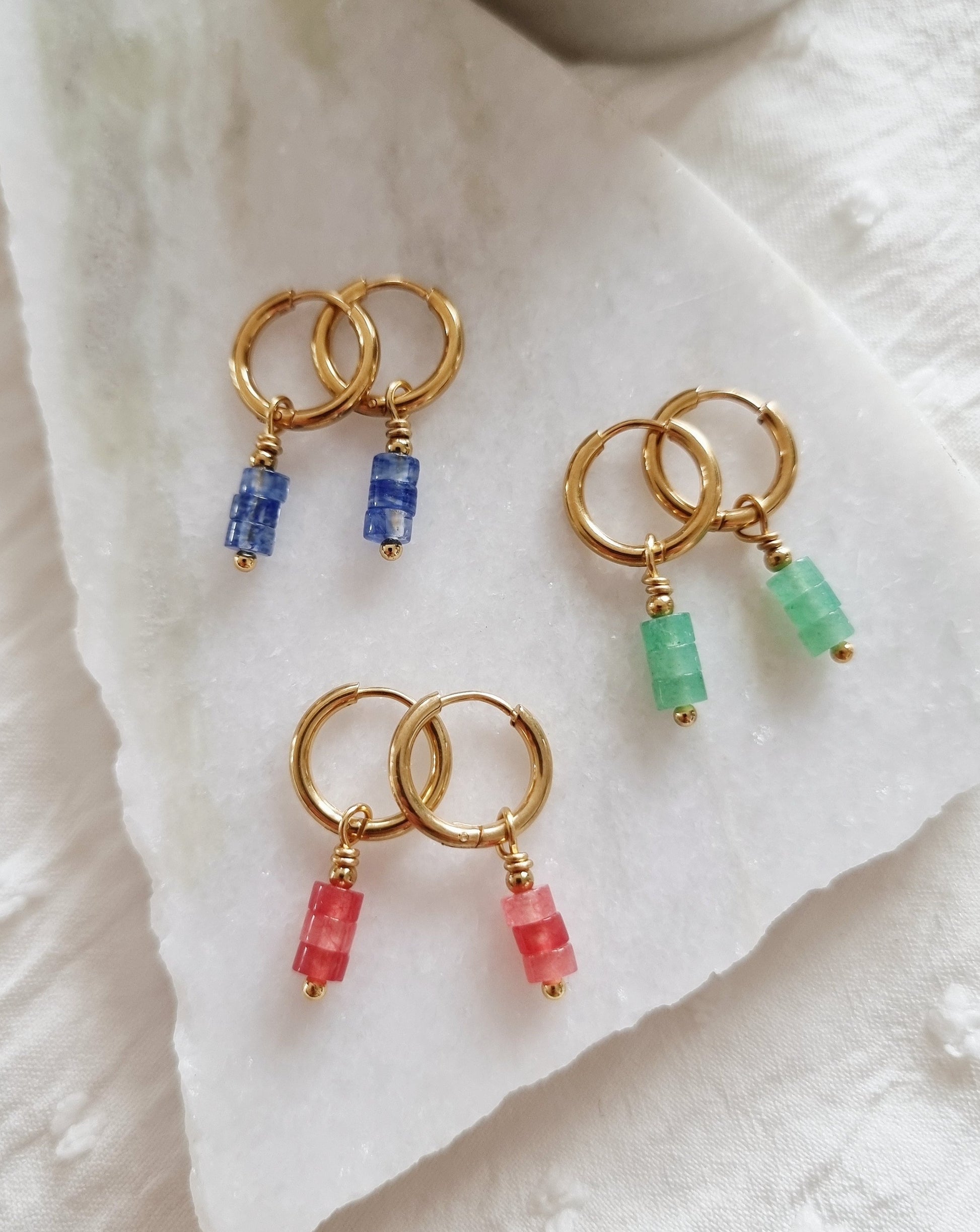 Add a splash of colour met de Dina oorbellen: gouden oorbellen, gemaakt van stainless steel, met kleurrijke edelstenen. Je kunt kiezen uit de volgende opties: