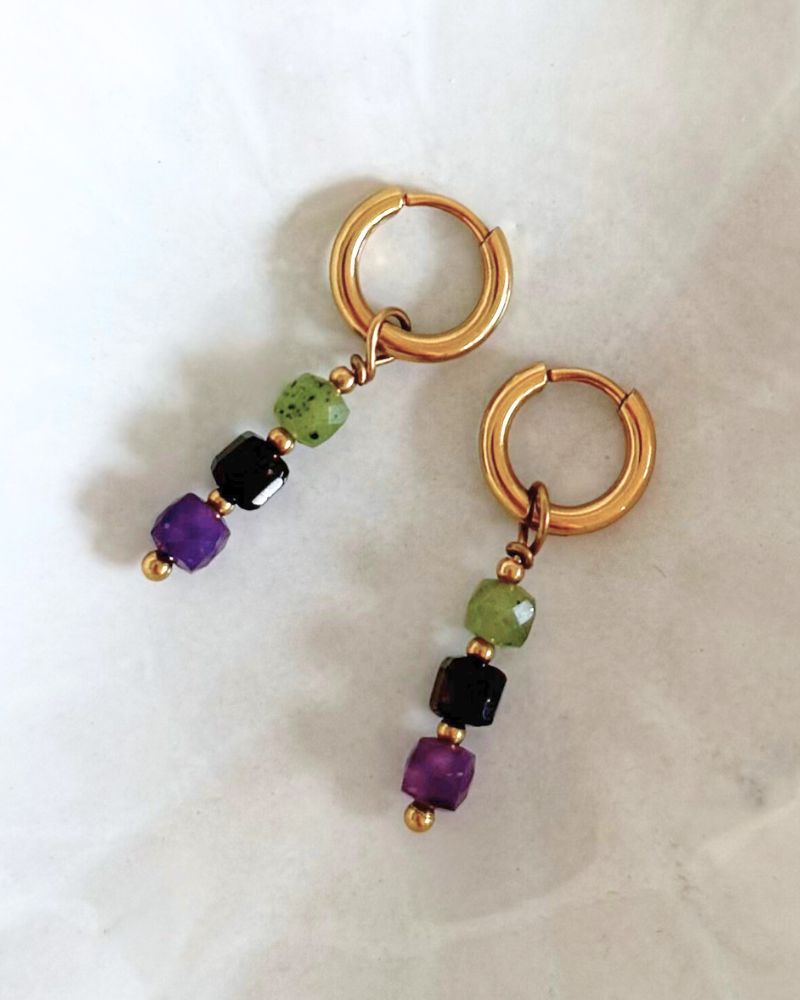 De Daphne oorbellen zijn gemaakt van goud stainless steel met paarse, rode en groene stenen. De groene steen is Jade, de rode steen in het midden is Granaatsteen en de paarse steen is Lepidoliet.
