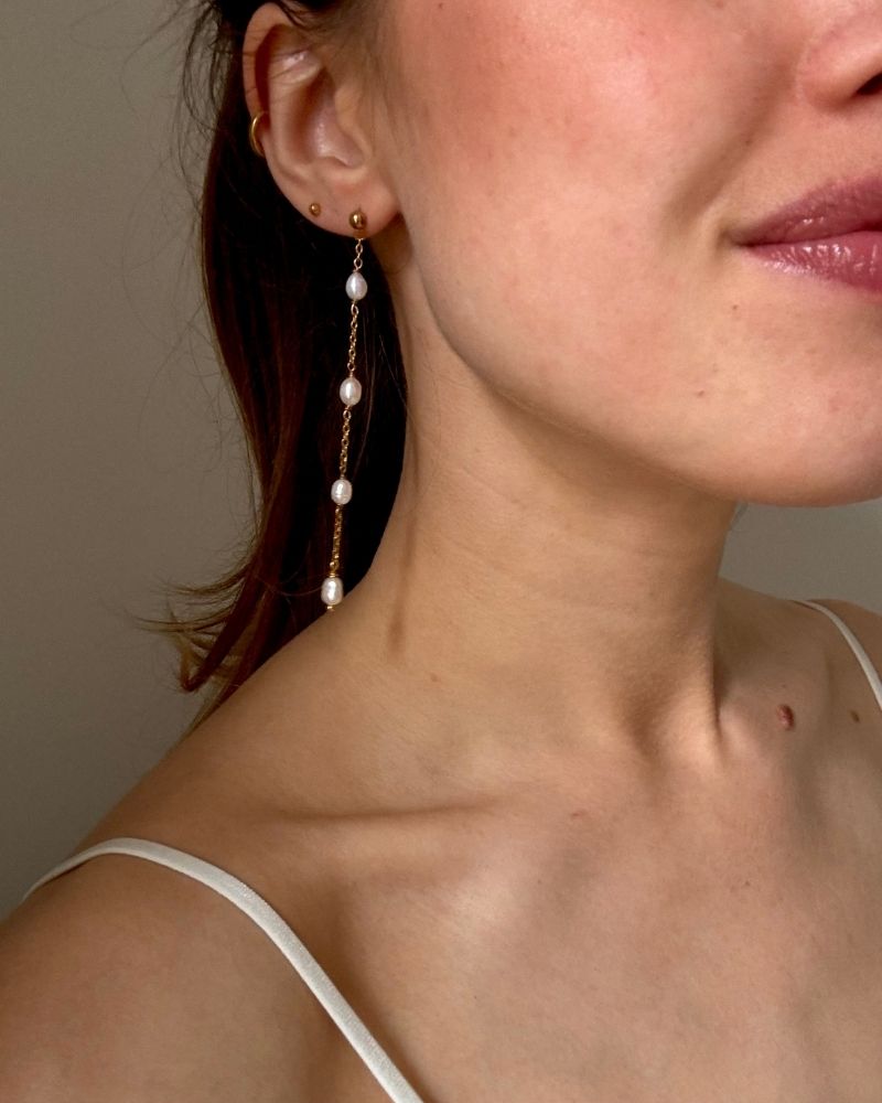 Met de lange gouden Camille oorbellen, elk gemaakt met 4 kleine parels, is jouw outfit in één keer compleet. Draag deze parel oorbellen met een outfit zonder al teveel kleuren of patronen, en combineer dit eventueel met bijpassende armband (zoals het Océane armbandje).