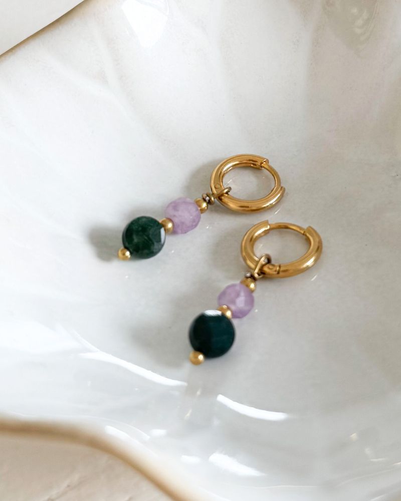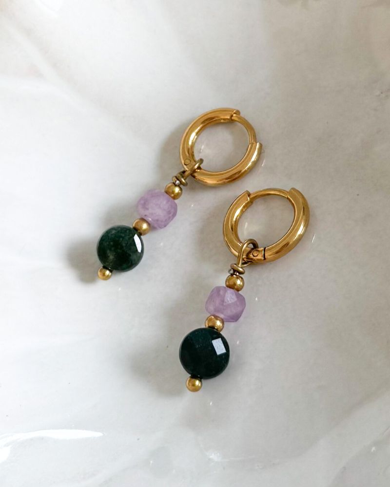 De Cleo oorbellen zijn gemaakt van goud stainless steel met paarse en groene stenen. De paarse steen is Lepidoliet en de groene steen is Mosagaat. Elke edelsteen is geslepen, waardoor de Cleo oorbellen extra mooi schitteren.