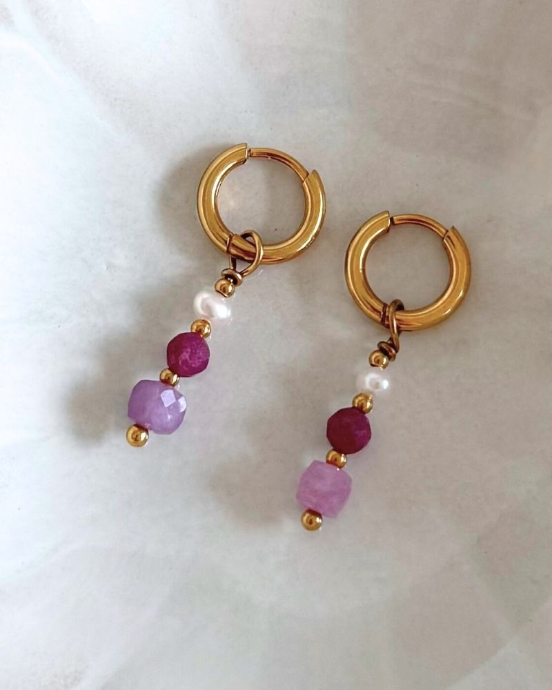 Deze stainless steel oorbellen zijn gemaakt met parels en roze edelstenen: Robijn (donker roze) & Lepidoliet (violet / roze). Elke edelsteen is geslepen, waardoor de Rose oorbellen extra mooi schitteren.