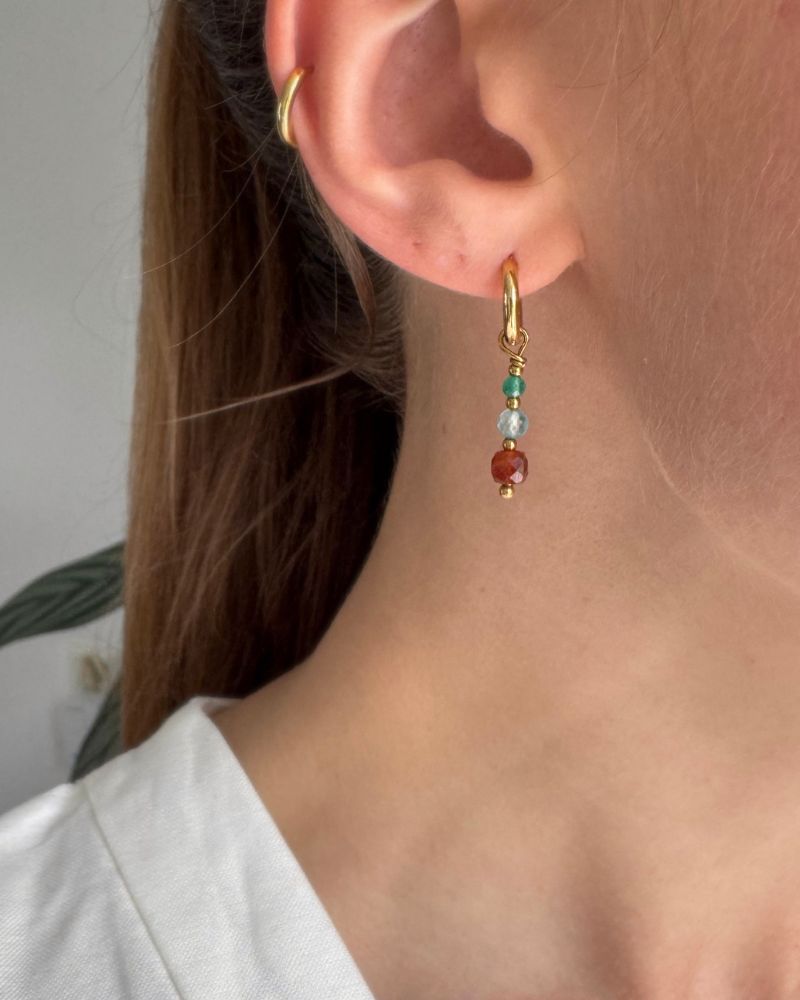 De Siena oorbellen zijn gemaakt van goud stainless steel en drie verschillende edelstenen. De bovenste edelsteen is Agaat, de edelsteen in het midden is Topaas en de onderste edelsteen is Granaatsteen. Elke edelsteen is geslepen, waardoor de kleurrijke Siena oorbellen extra mooi schitteren.