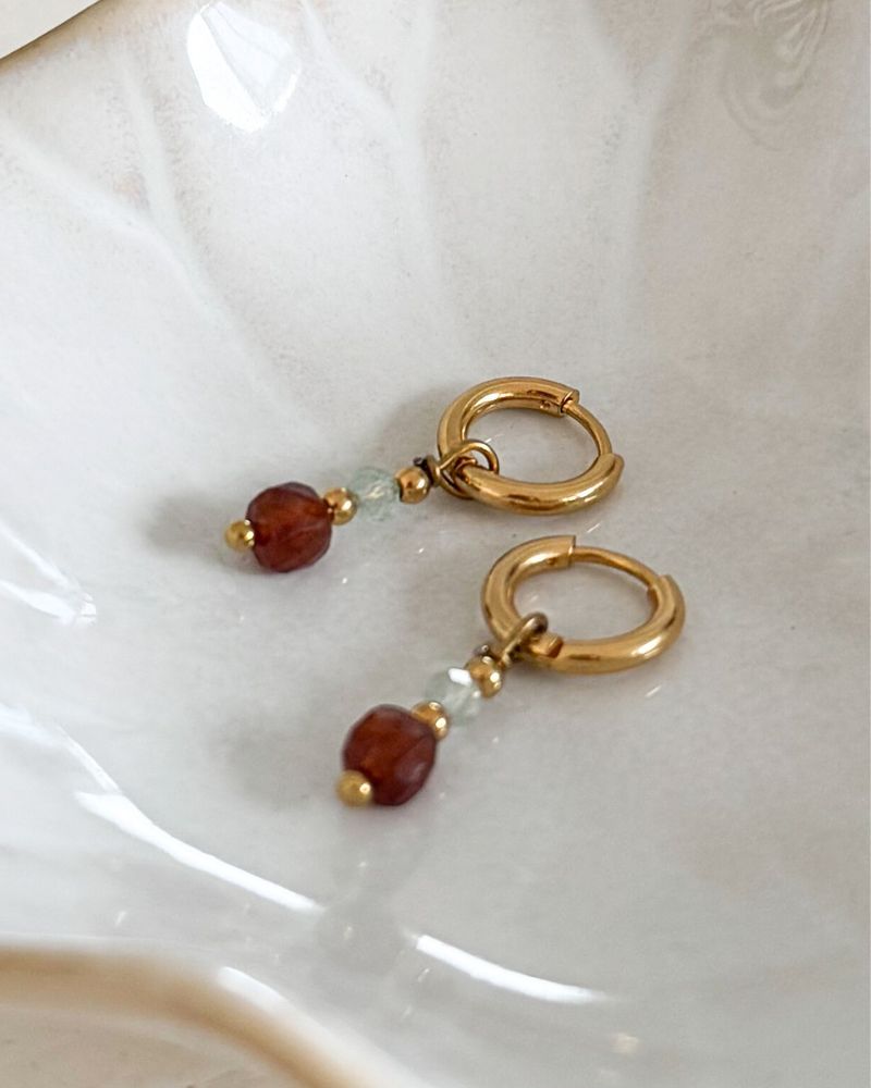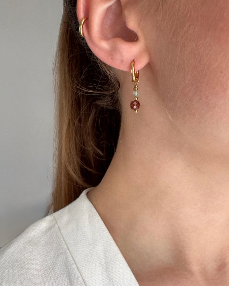 De Indi oorbellen zijn gemaakt van goud stainless steel en 2 edelstenen. De bovenste edelsteen is groene Aardbeienkwarts, en de vierkante edelsteen is Granaatsteen. Elke edelsteen is geslepen, waardoor deze subtiele oorbellen prachtig schitteren.